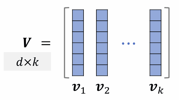 • 把它们作为矩阵 VRd×k\mathbf{V} \in \mathbb{R}^{d \times k} 的列。