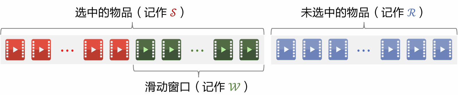 • 解决方案:设置一个滑动窗口 W\mathcal{W},比如最近选中的 10 个物品,用 W\mathcal{W} 代替 MMR 公式中的 S\mathcal{S}